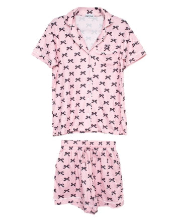 Get ready to lounge in style with our Black & Pink Mini Coquette Bows Loungewear Set! These light pink pajamas are adorned with adorable little black bows, bringing a chic and playful vibe to your relaxation routine. Perfect for a cozy night in, a sleepover with friends, or simply adding a touch of girly charm to your loungewear collection, this set is as comfortable as it is cute. Embrace the coquette trend and elevate your downtime with this trendy loungewear set