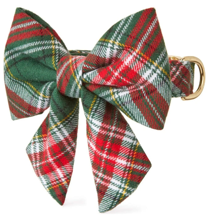 Your pup will have a holly jolly Christmas in this festive red and green plaid lady bow collar. Please note: pattern placement will vary. Includes a removable matching bow for two looks in one.