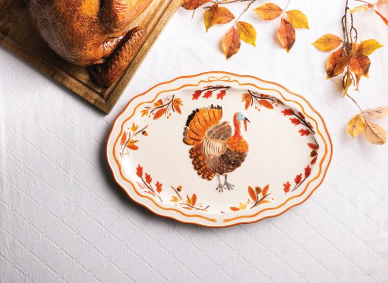Add a touch of charm to your dining experience with this Turkey Whimsical Platter. Crafted from high-quality dolomite, this ceramic platter features a delightful hand-painted scallop edge that adds an artistic flair to any table setting. Measuring 12 3/4" x 18 1/2", it's the perfect size for serving your favorite holiday dishes, from roasted turkey to an array of appetizers. The vibrant design and sturdy construction make it both a functional and decorative piece, ideal for festive gatherings or everyday use. Elevate your culinary presentation with this unique and eye-catching platter that effortlessly combines style and practicality.